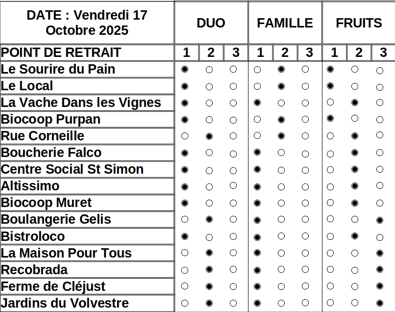 - Vous choisissez le lieu de retrait de votre choix (voir carte sur la page d'accueil) et la taille de panier souhaité: